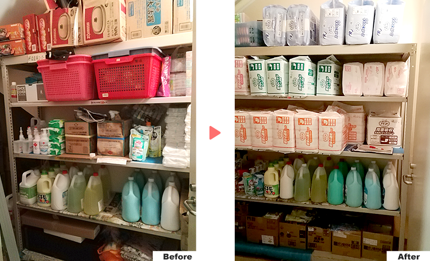 使用頻度の高いものから入り口近くに収納し、介護師さんが奥まで探さなくても欲しい物が取れるようにしました。