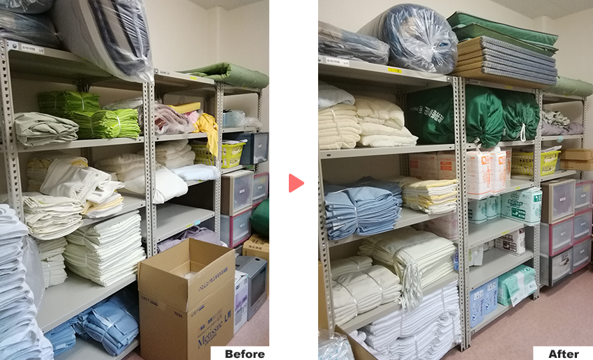 リネン庫の物品を分類し、使用頻度を考慮し収納しました。