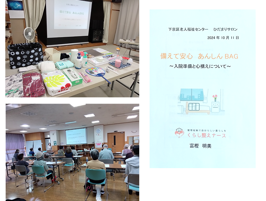 37年間の病院勤務経験から考えた、急な入院に準備して欲しい物品を持参し、手に取って見て貰っています。